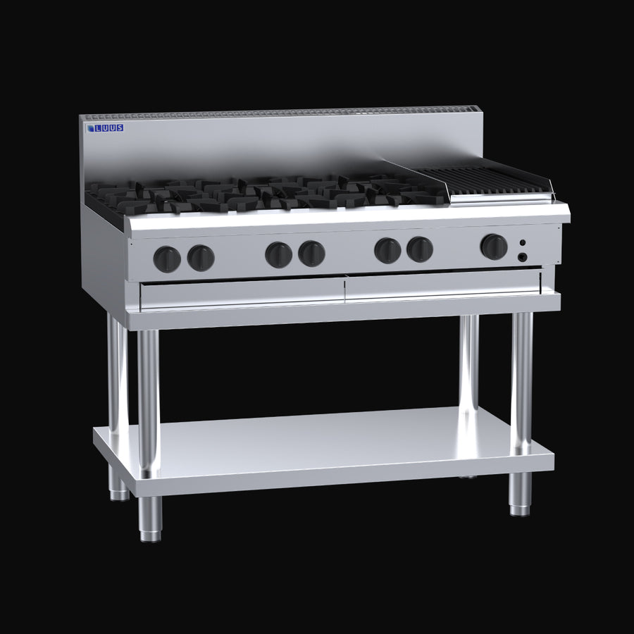 • Engineered to higher specifications, the CS-6B3C unit is a 1200mm wide, compact high performance six burner cooktop with 300mm chargrill. Available as a benchtop or freestanding with an undershelf storage area.