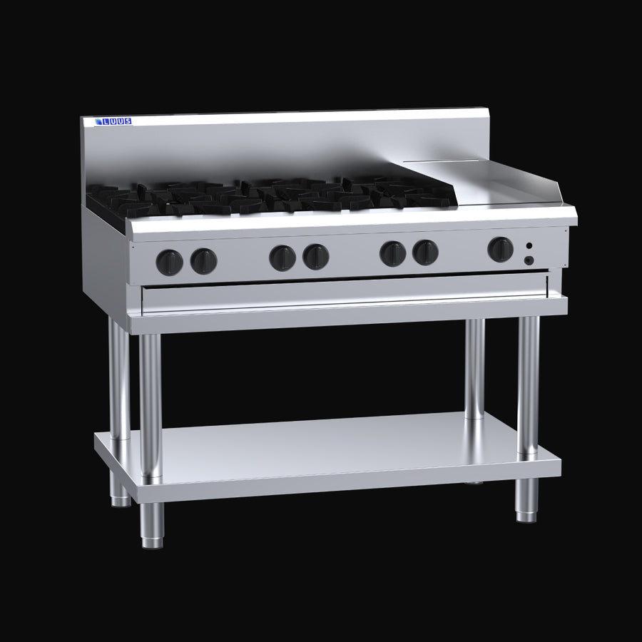 • Engineered to higher specifications, the CS-6B3P unit is a 1200mm wide, compact high performance six burner cooktop with 300mm griddle. Available as a benchtop or freestanding with an undershelf storage area.
